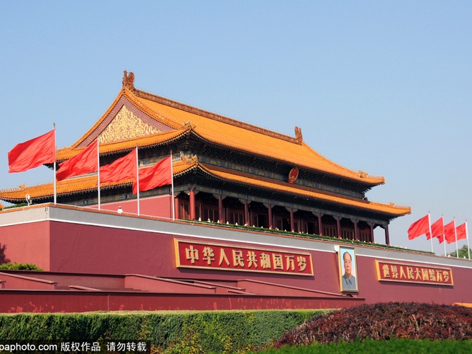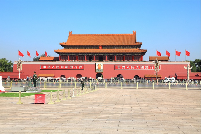 А ворота Тяньаньмэнь расположены в центре Пекина - столицы Китайской Народной Республики, в южной части Запретного города, они обращены к площади Тяньаньмэнь и Памятнику народным героям, Мавзолею Председателя Мао Цзедуна, Дому народных собраний и Национальному музею Китая через улицу Чанъань и занимает площадь в 4 800 квадратных метров. Обладая выдающимся архитектурным искусством и особым политическим статусом, площадь привлекает внимание всего мира.