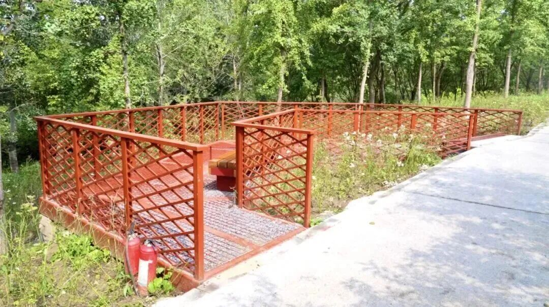 Особенно привлекает внимание смотровая площадка, построенная из красных стальных конструкций, площадью 28 квадратных метров. На ней установлены удобные скамейки для отдыха прохожих.