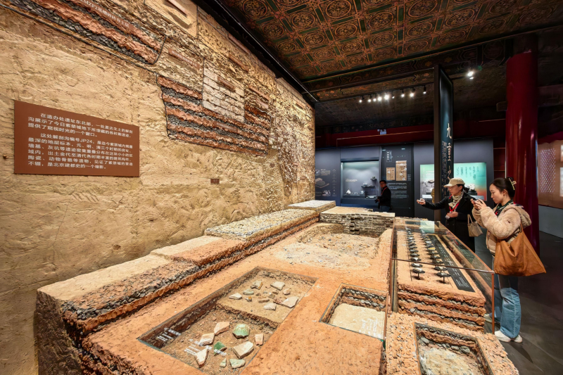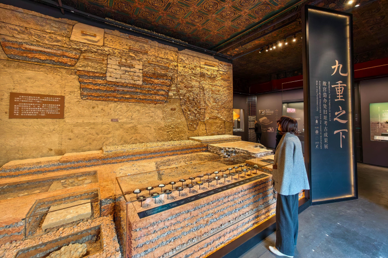 Наиболее значимые результаты собраны на одной выставочной стене – это воссозданный в масштабе 1:1 разрез археологического шурфа под номером JP24. На пересекающихся следах лопат переплетаются и накладываются друг на друга фундаменты стен и различные реликвии династий Юань (1271-1368), Мин (1368-1644) и Цин (1644-1911). Здесь также встречаются фрагменты архитектурных элементов, керамики, костей животных и других реликвий, относящихся к периодам от династии Цзинь (1115-1234) до династии Цин.