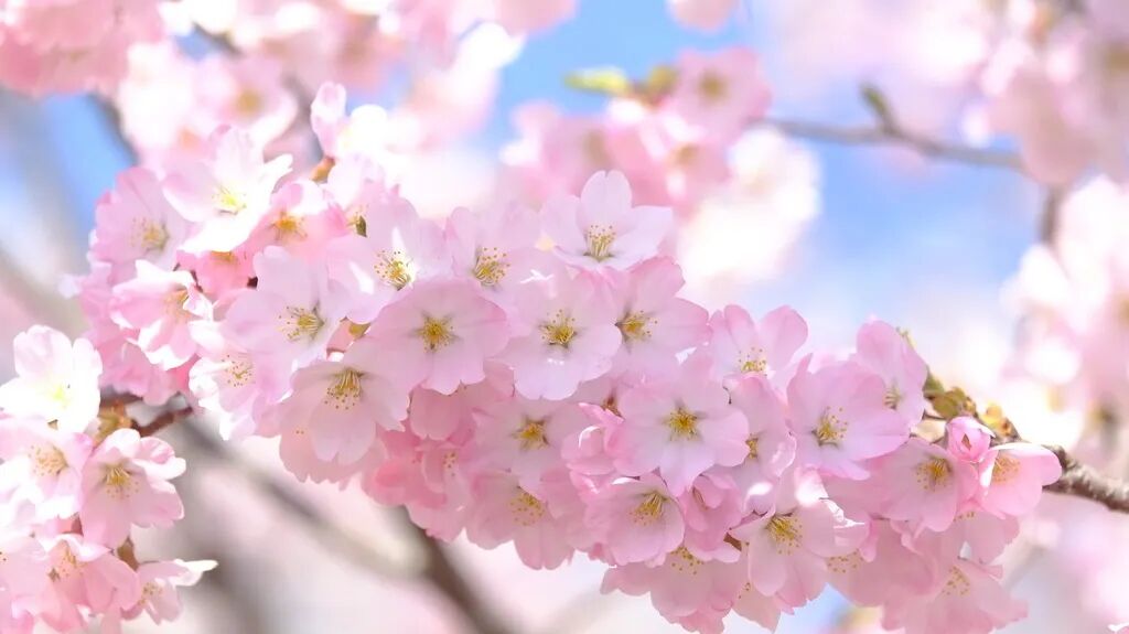 Лепестки бледно-розового и белого цветов распускаются на ветвях, напоминая нефритовых бабочек, готовых взлететь, или чашки, наполненные нектаром весны.