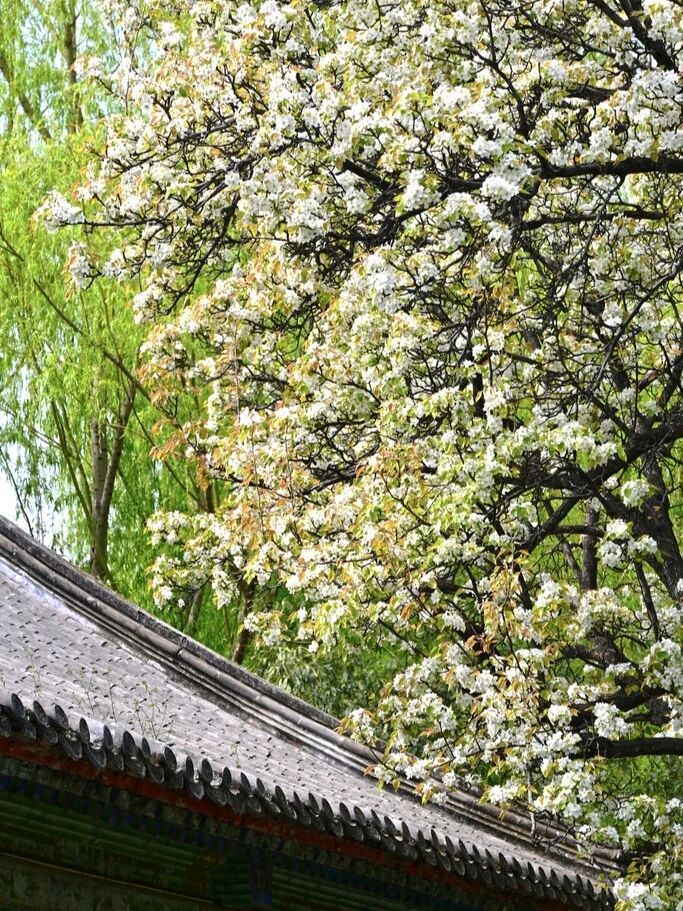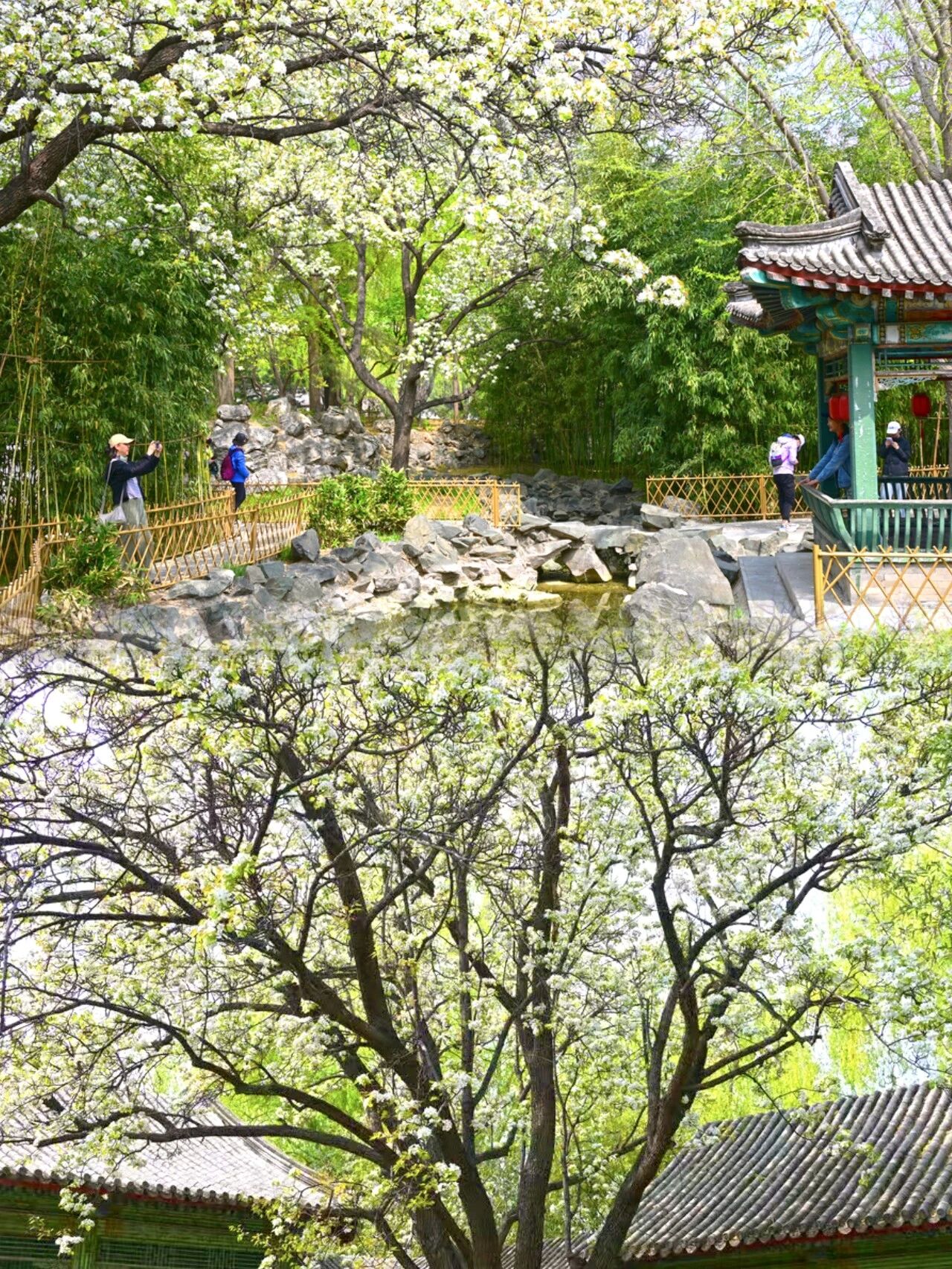 На днях в павильоне «Сяосян» парка «Дагуаньюань» в Пекине наступил пик цветения грушевых деревьев. Белоснежные и изящные цветы покрывают ветви, гармонично сочетаясь с зеленым бамбуком и старинными постройками, воссоздавая изящный и поэтичный весенний пейзаж из романа «Сон в красном тереме».